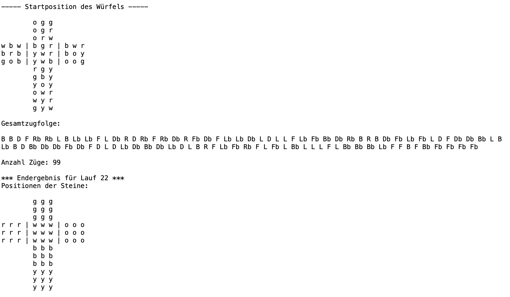 Im Zentrum stand die Idee, nicht blind durchzuprobieren, sondern ein Gefühl für die Struktur der Lösung zu entwickeln – wie man durch geeignete Kombinationen von Zügen dem Zielzustand näherkommen kann. Dabei habe ich keinen fixen Lösungsweg implementiert, sondern eher einen Ansatz verfolgt, bei dem sich im Laufe der Zeit ein Algorithmus herauskristallisiert hat.